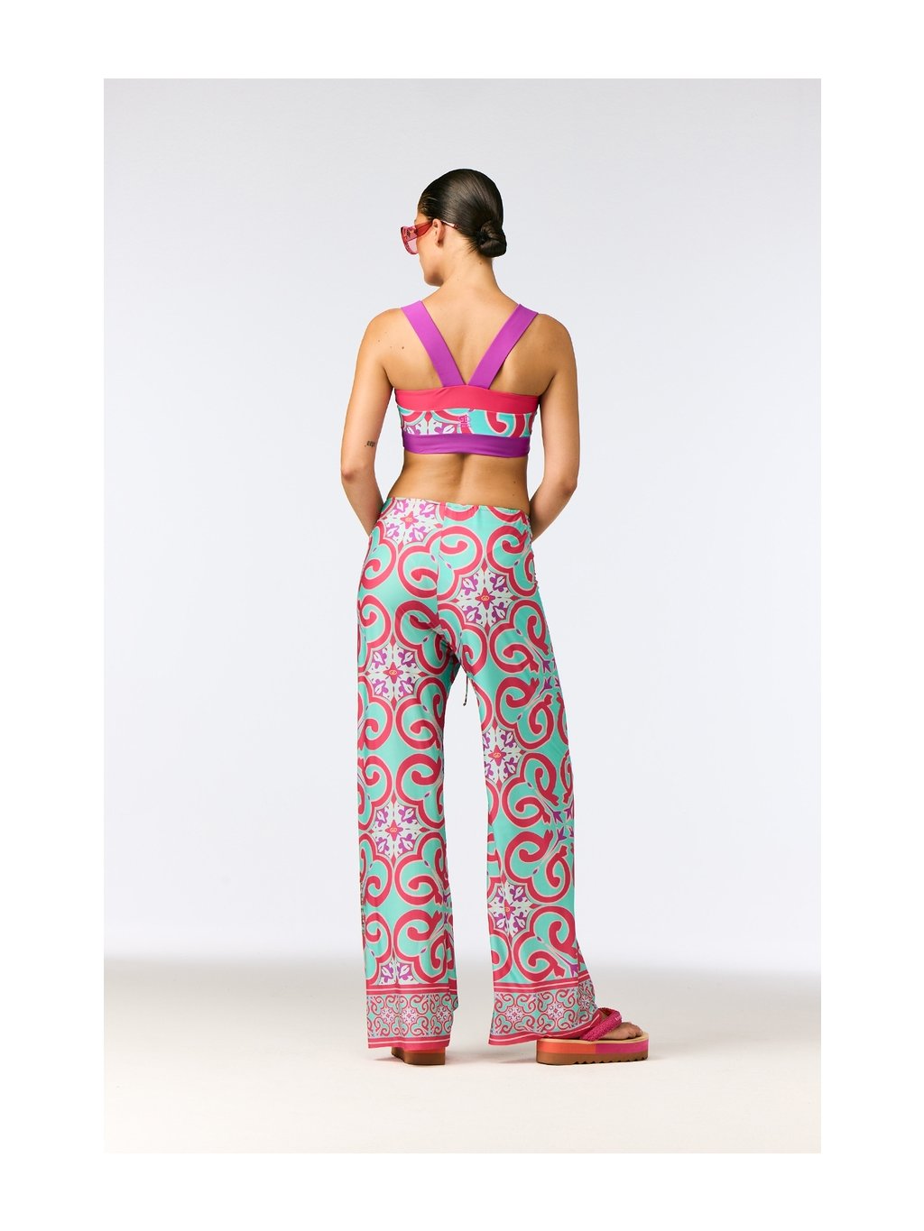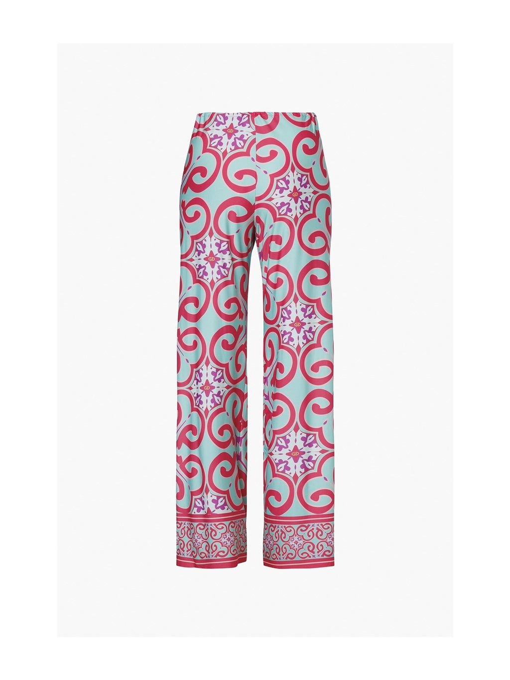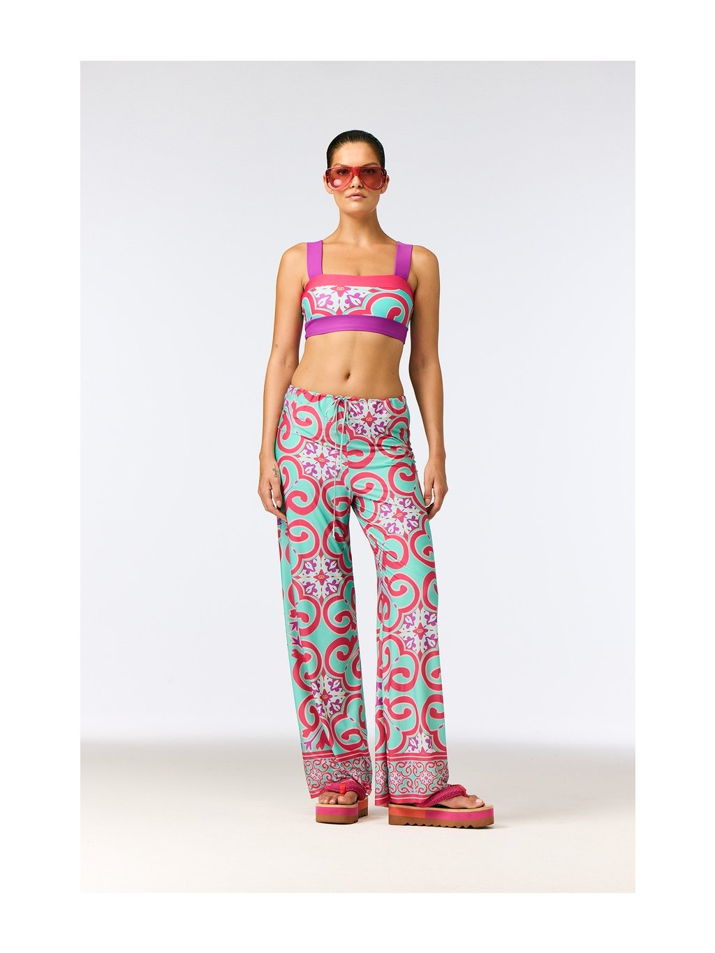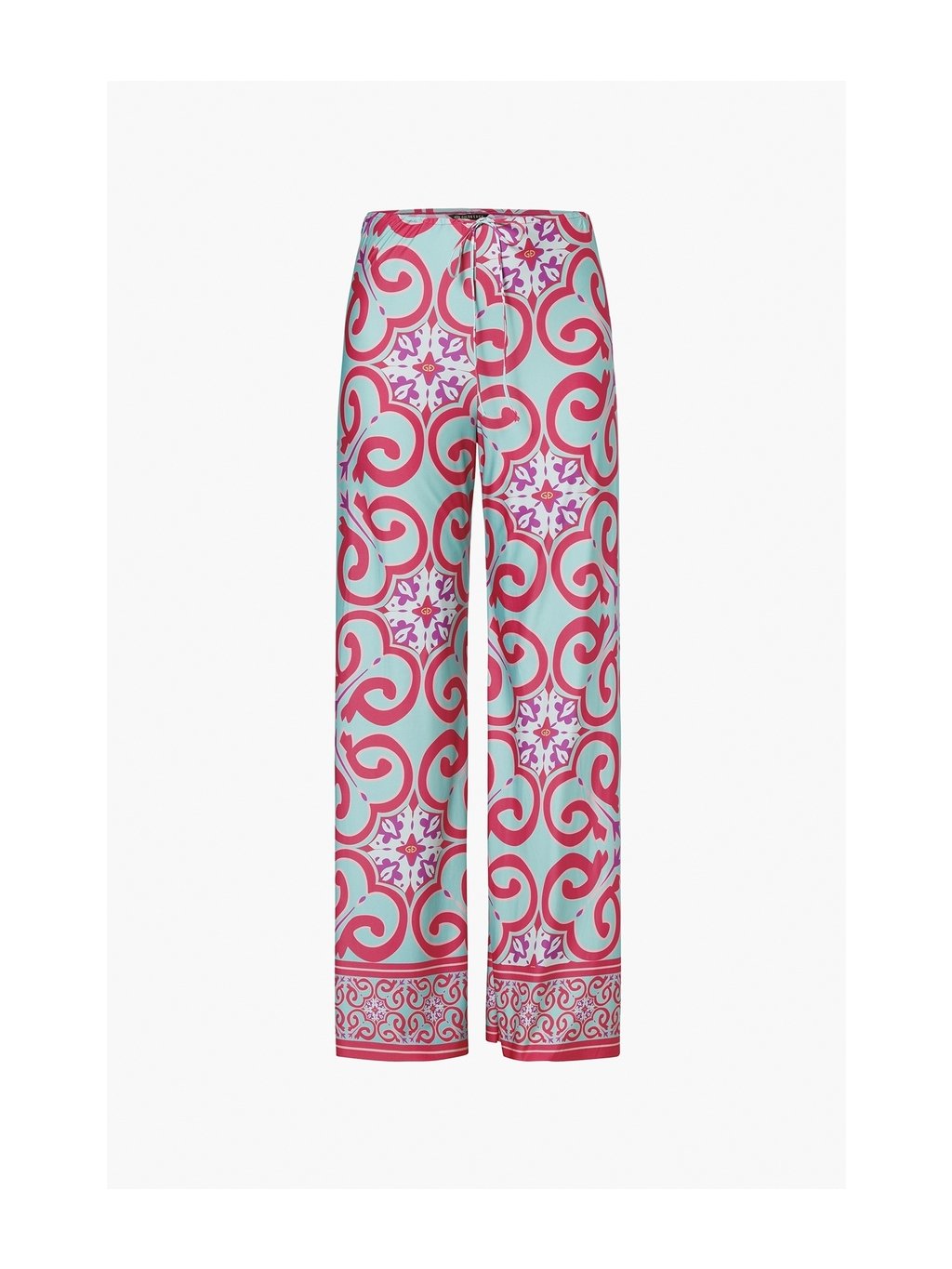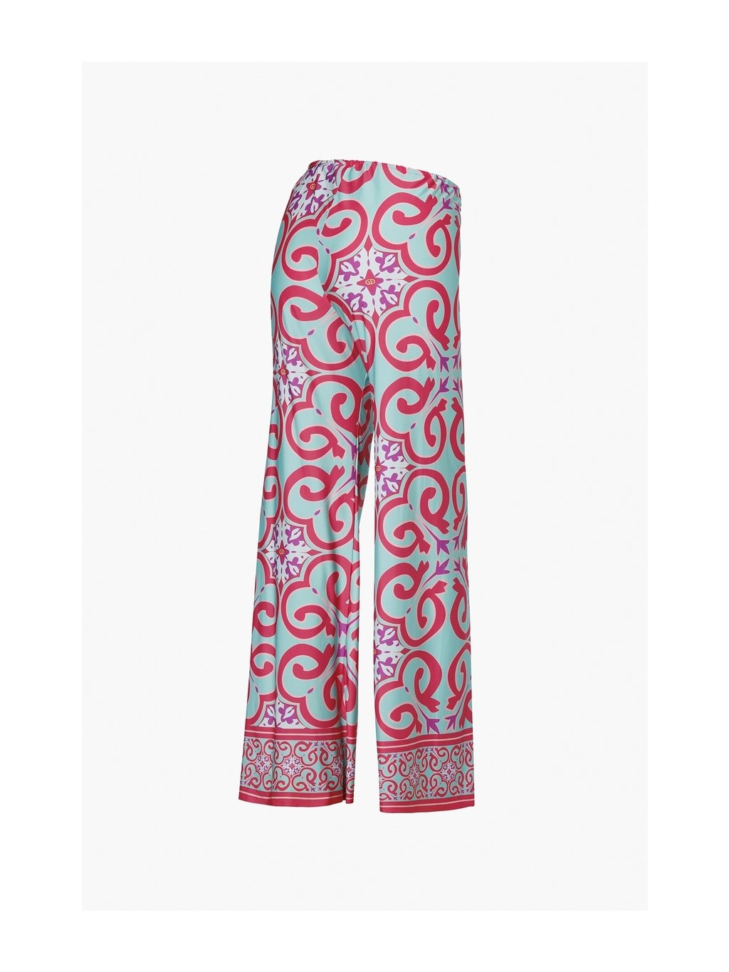 Plážové nohavice TROPINA s celoplošnou Capri tile potlačou prinášajú pohodlie a štýl. Voľný strih a ľahký saténový materiál zaručujú dokonalý letný komfort pri vode aj na pláži.