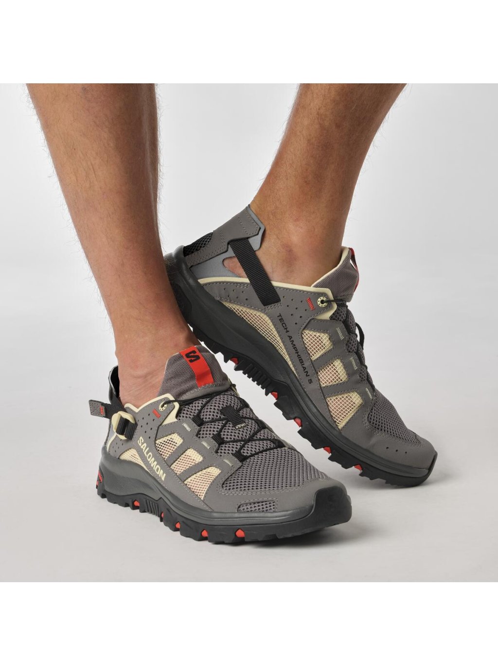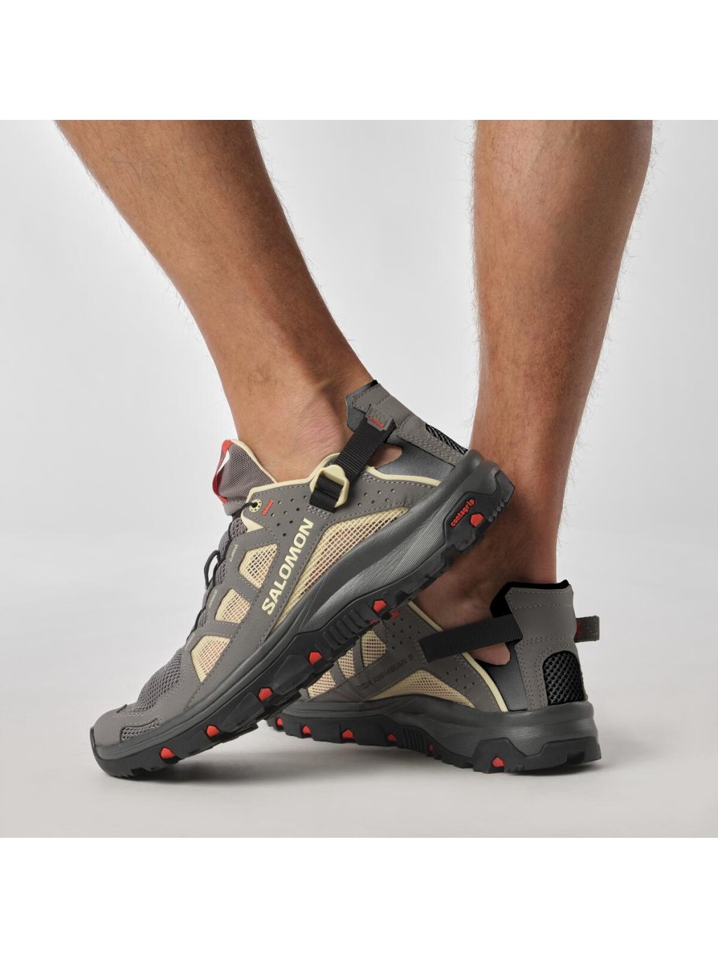 Turistické sandále Salomon Techamphibian 5 sú dynamickejšie ako kedykoľvek predtým, no zároveň zostávajú jednoduché a funkčné. Predstavujú úspešný kompromis medzi nízkymi topánkami a sandálmi. Vystužená špička TECHAMPHIBIAN 5 a plne prešívaná konštrukcia, ktorá je plne oddaná mokrým a divokým aktivitám, udržia vaše nohy v bezpečí, zatiaľ čo jej lepkavá podrážka zaisťuje priľnavosť na klzkom teréne. Sú vhodné do ľahšieho horského terénu (na chodníky bez ostrých kameňov, kde hrozí roztrhnutie sieťoviny), na chôdzu vo vode a na bežné letné nosenie. Môžete ich použiť tam, kam by ste sa v sandáloch neodvážili a v nízkej trekovej obuvi by vám bolo horúco. Vďaka skladacej päte sa dajú nosiť aj ako rýchlo nazúvateľné papuče.