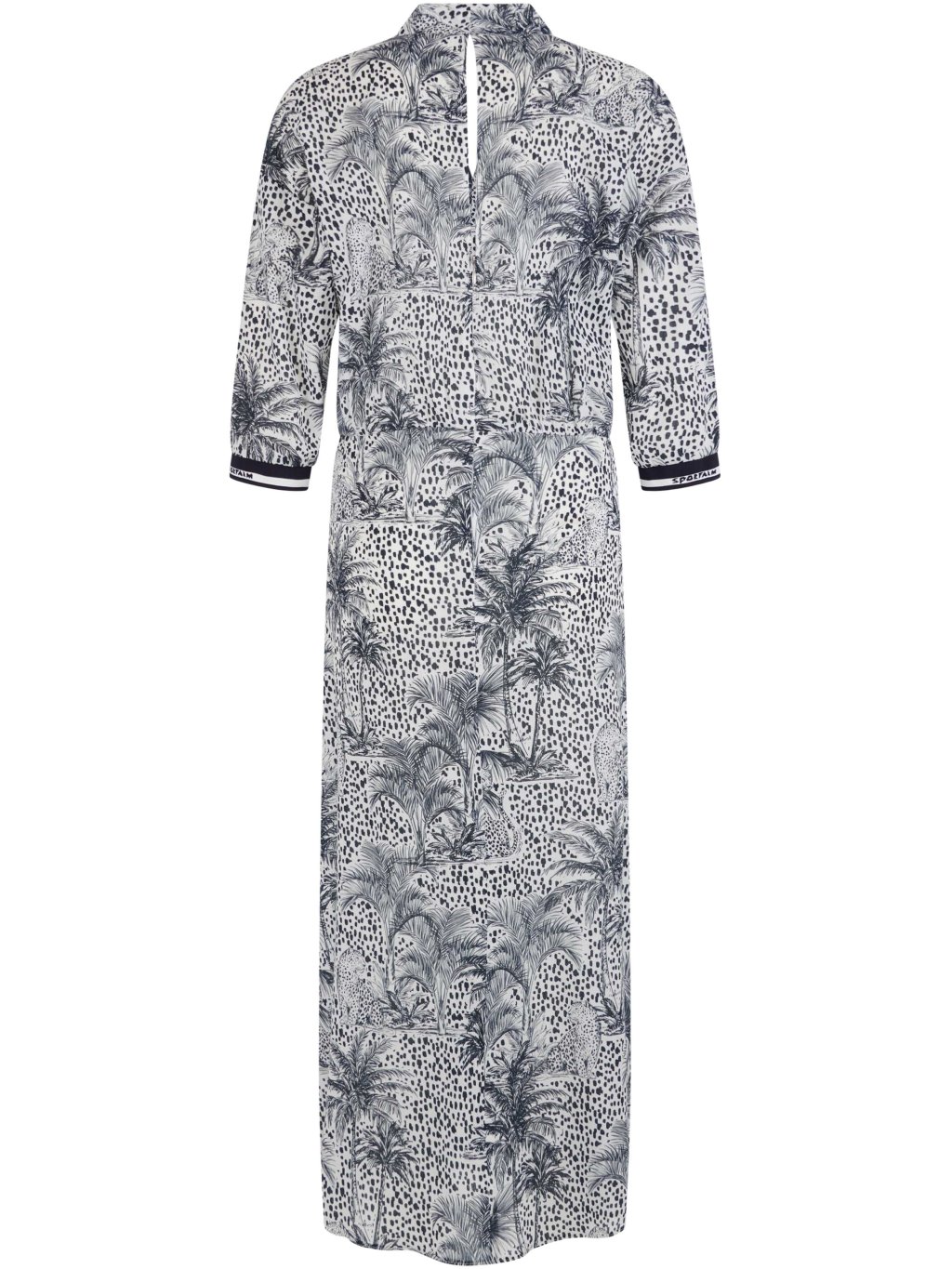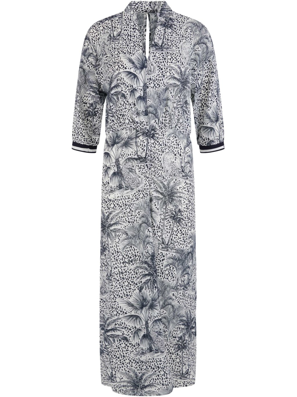 Ľahké šaty z jemného viskózového materiálu s výraznou džungľovou potlačou a športovým detailom v podobe pletených lemov s logom.