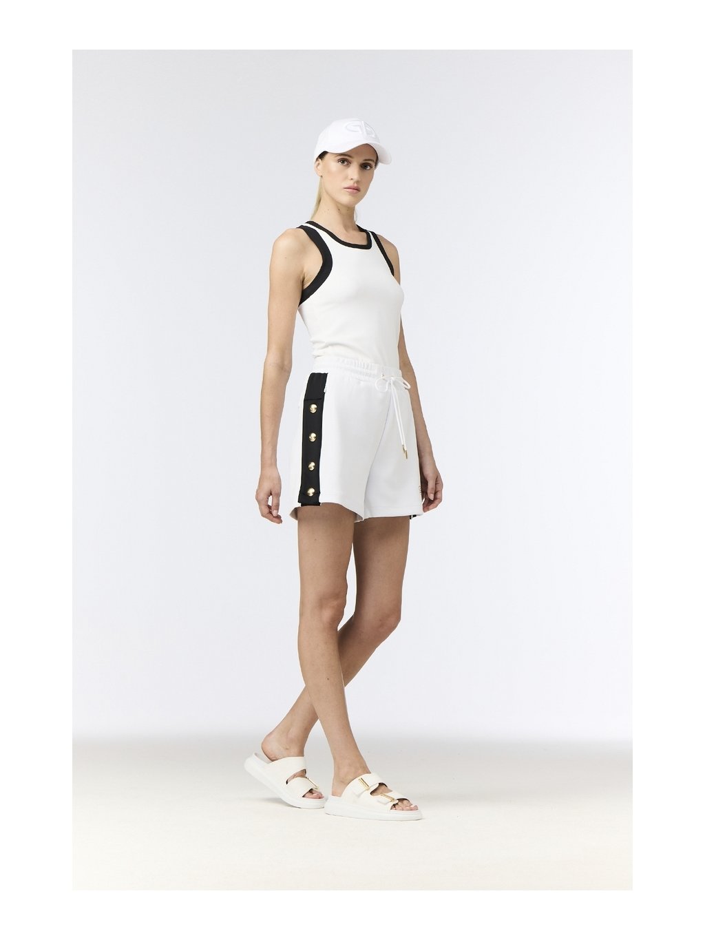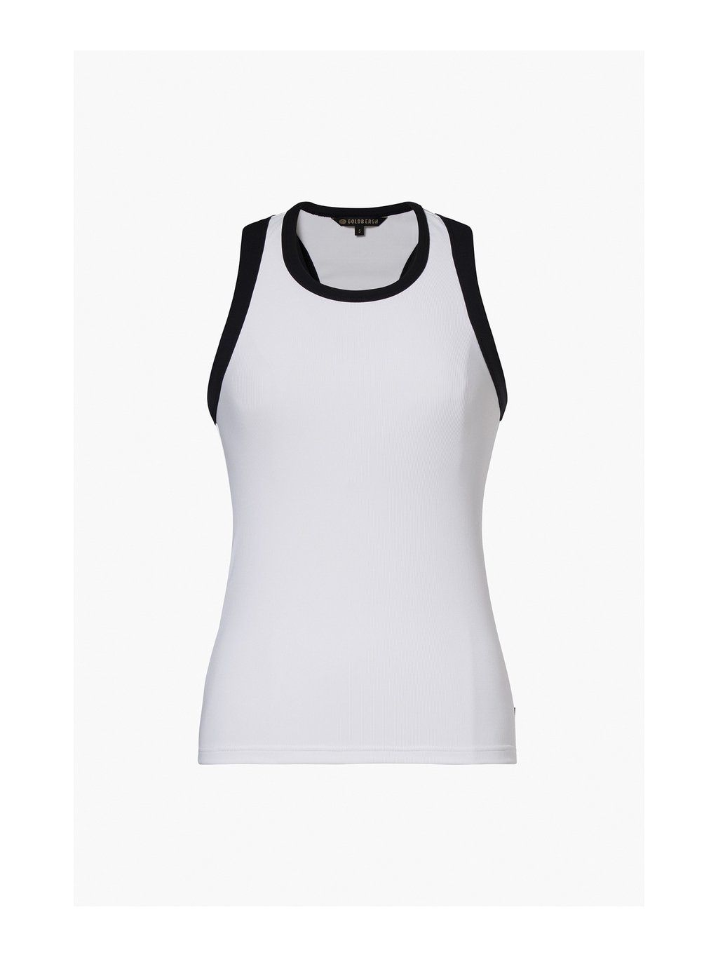 Dámsky top bez rukávov GABRIELLE je štýlový a funkčný kúsok, ktorý by nemal chýbať v šatníku aktívnej ženy. Vďaka priliehavému slim fit strihu krásne zvýrazní siluetu a zároveň poskytuje maximálne pohodlie pri pohybe. Štruktúrovaný 2x2 rebrovaný materiál je pružný, príjemný na dotyk a dokonale sa prispôsobí telu. Kontrastné čierne lemy dodávajú topu moderný športový vzhľad. Funkčný materiál s technológiou odvodu vlhkosti, rýchleho schnutia a úpravy proti zápachu zaručuje komfort aj počas náročnejších aktivít. Dizajn dopĺňa gumová potlač loga na zadnej strane a tkaný brandový štítok na boku.