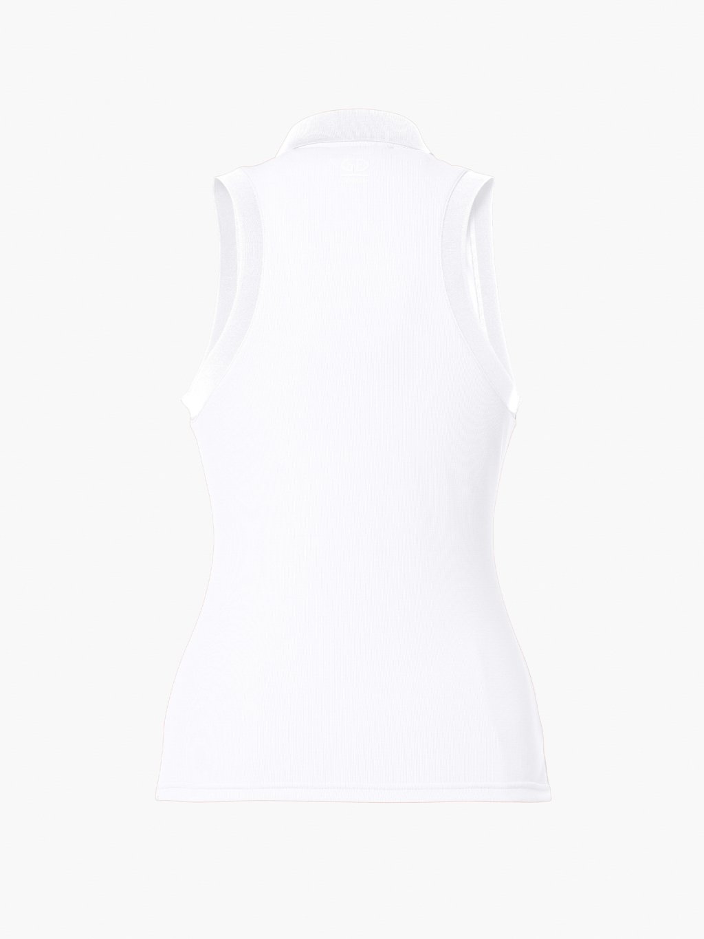 Bezrukávový polo top Caroline je navrhnutý v úzkom strihu, ktorý perfektne obopína telo. Vyrobený je z 2x2 štruktúrovaného rebrovania, ktoré dodáva materiálu pružnosť a komfort. Má tonálne rebrovaný polo golier s V-výstrihom, ktorý zaručuje štýlový vzhľad.