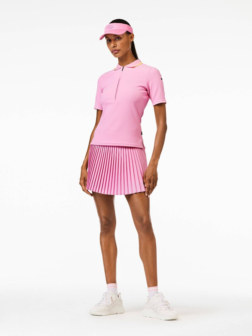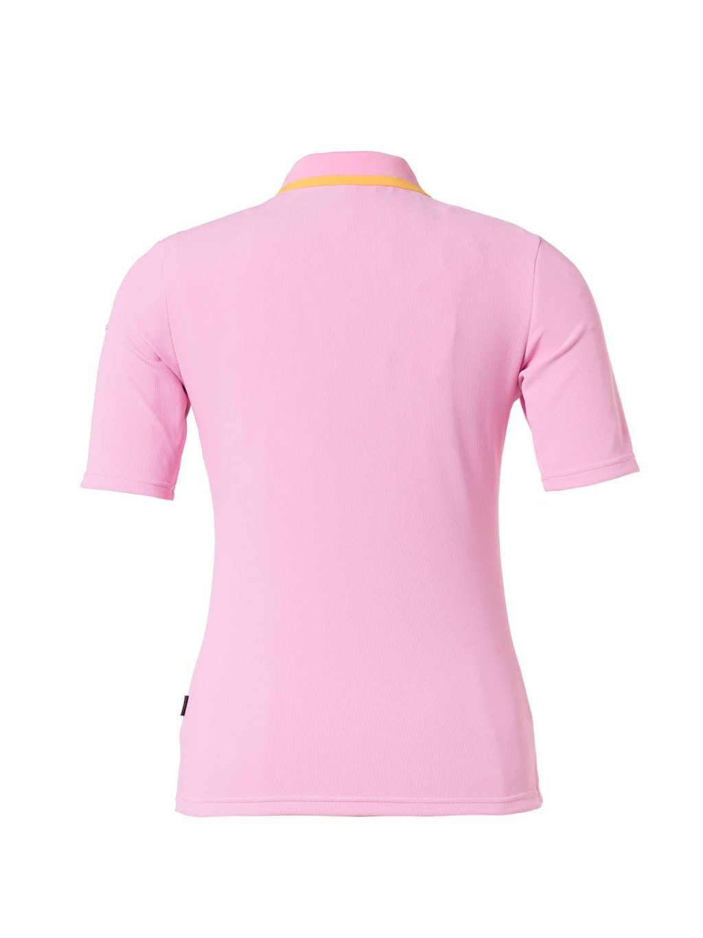 Dámske polo tričko CASSIA z kolekcie Golden Resort je ideálnou voľbou pre jarné či letné športové aktivity. Zaujme Vás čistým dizajnom, krásnou ružovou farbou, pohodlným strihom a elegentnými detailami v podobe štýlového prešitia zlatou lurexovou niťou a logom Goldbergh na rukáve. Na tomto tričku Vás upúta aj kvalitný materiál, ktorý je priedušný, elastický a rýchloschnúci. Dokonalý vzhľad trička dopĺňa aj rebrovaný polo golier s kontrastom papáje, ktorý sa hodí ku každému typu tváre a tiež na každú príležitosť. Najlepšie vynikne k športovej sukni, kraťasom či nohaviciam a zapína sa na tónovaný 1/2 zips.